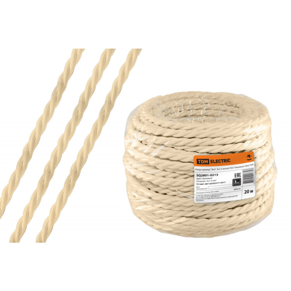 Ретро провод "Эко" 3х1,5 витой ГОСТ бежевый (20м) SQ2801-0213, Кабель и провод силовой для стационарной прокладки