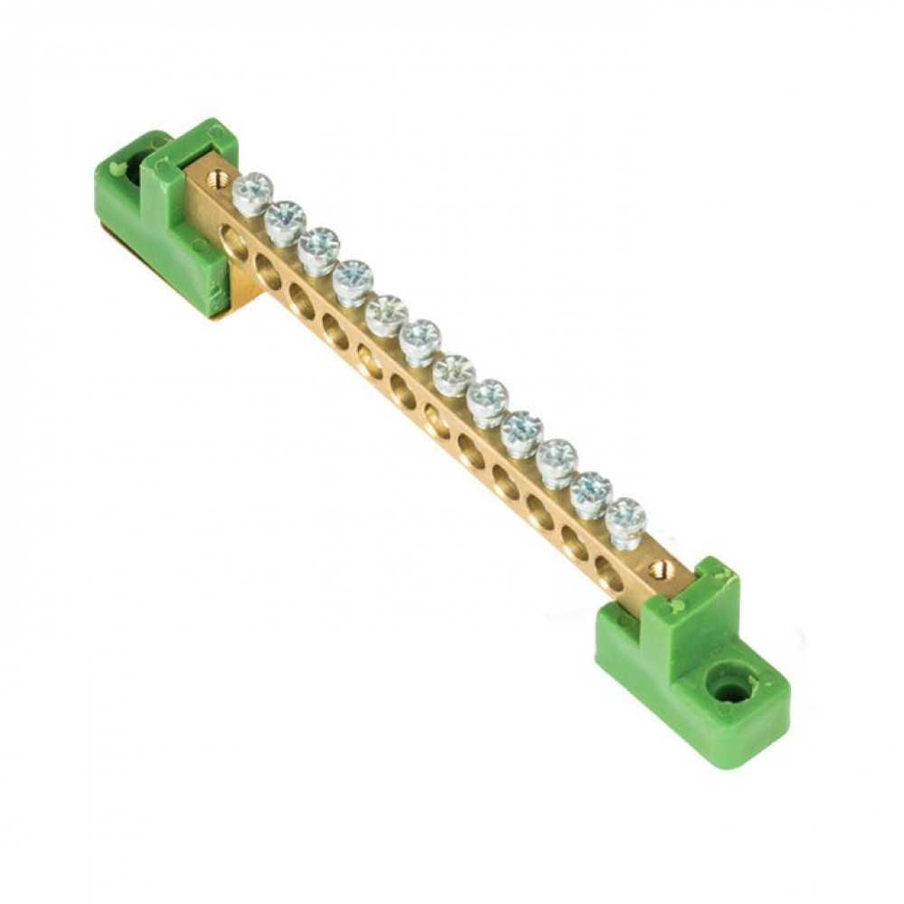 Шина "0" PE 6x9мм 12 отверстий латунь с контактной пластиной 2 зелёных угловых изолятора PROxima sn0-63-12-2-pe, Блок клеммный и нулевая шина