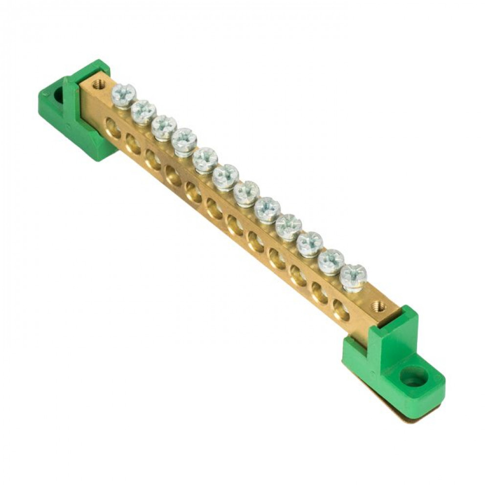 Шина "0" PE 8x12мм 12 отверстий латунь с контактной пластиной 2 зелёных угловых изолятора PROxima sn0-125-12-2-pe, Блок клеммный и нулевая шина