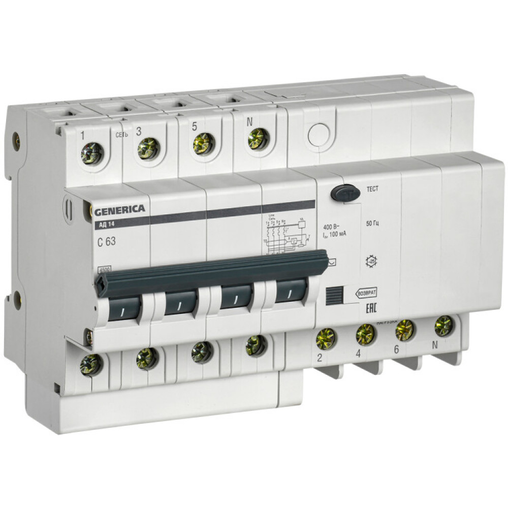 Диф. автомат АД14 4Р 63А 100мА MAD15-4-063-C-100, Дифференциальная защита: УЗО, дифф блок