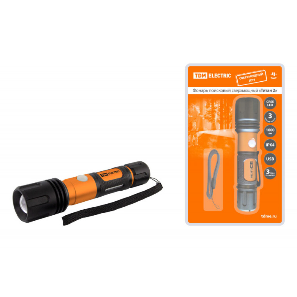 Описание Фонарь «Титан 2» 10 Вт 1 светодиод CREE 1000 лм, 1х18650 3.7 В 2200 мА*ч , IPX4, USB, SQ0350-0061