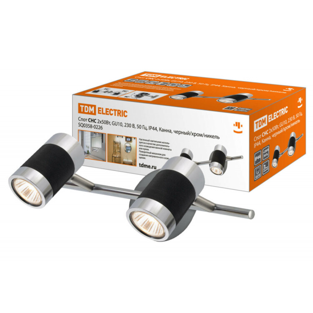 Описание Спот СНС 2х50Вт, GU10, 230 В, 50 Гц, IP44, Канна, черный/хром/никель SQ0358-0226