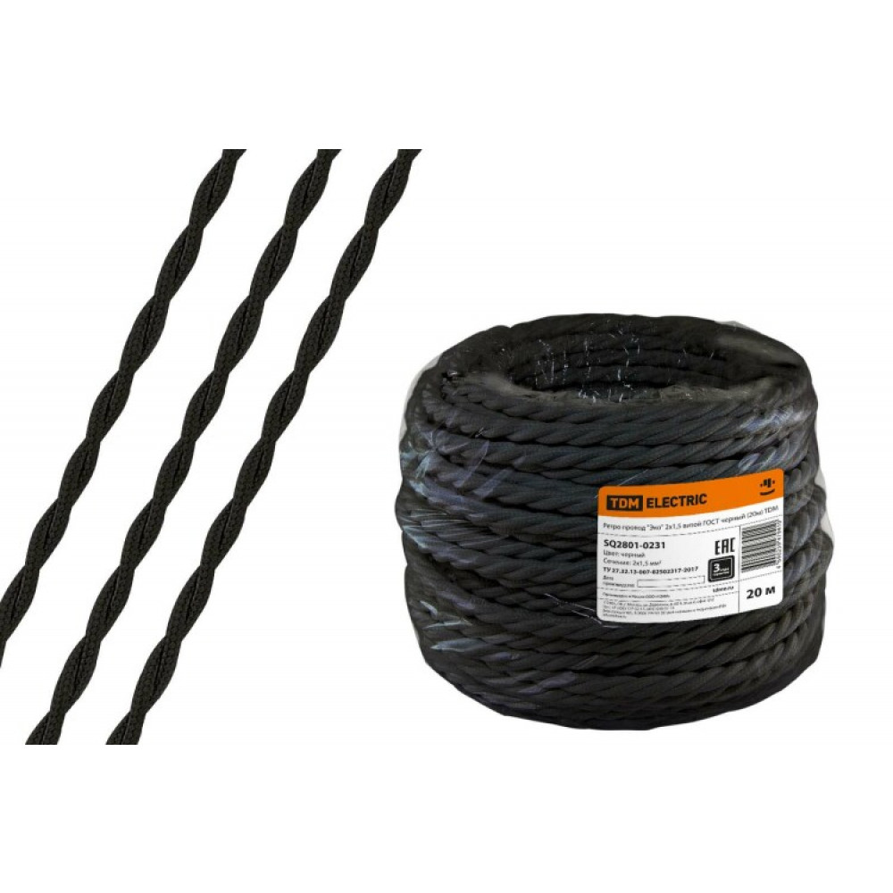 Описание Ретро провод "Эко" 2х1,5 витой ГОСТ черный (20м) SQ2801-0231