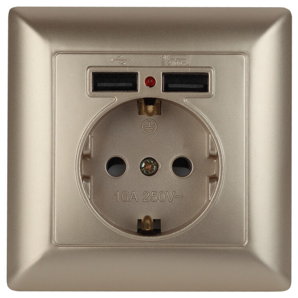 Описание 4-410-04 Розетка P+E Schuko со шторками, 16А-250В + 2хUSB, СУ, Solo, шампань (10/100/2500) Б0043406