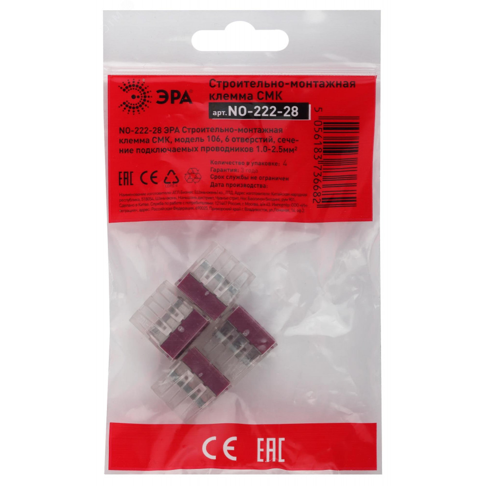 Доставка NO-222-28 Клемма СМК, серия 106, 6 отверстий, 1.0-2.5мм2 (упак. 4 шт.) (4/3600/64800) Б0033401