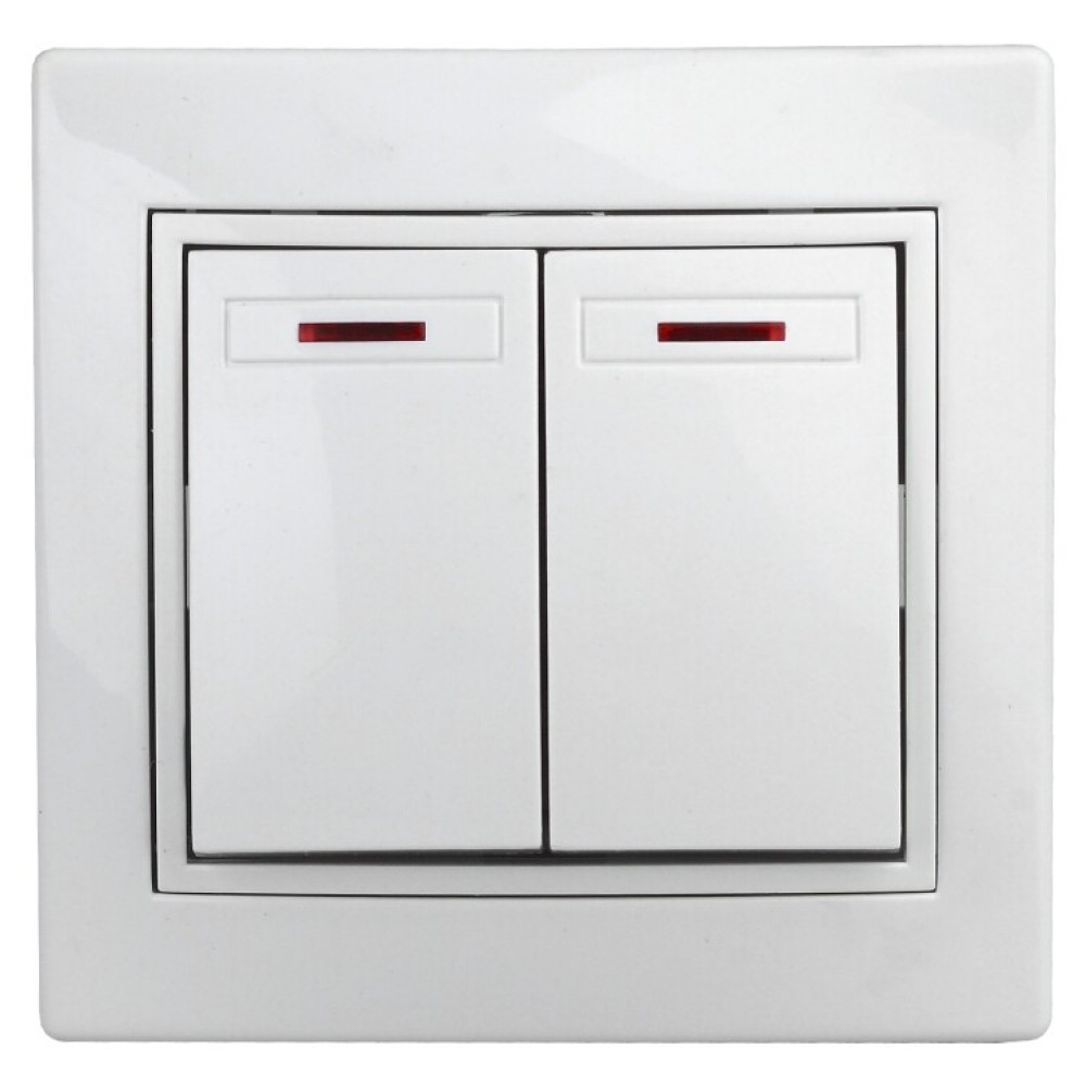 1Э-105-01 Выключатель двойной с подсветкой, 10А-250В, СУ, б.л., Plano, белый (10/200/2400) Б0038826, Выключатель и переключатель скрытого монтажа