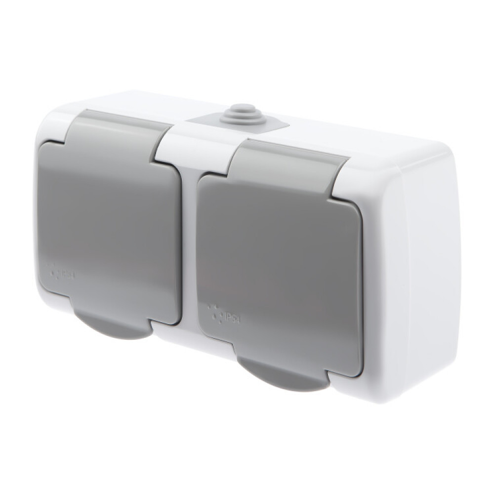 Розетка Atlantic 5-203-03 двойная с заземлением 2х2P+E Schuko, 16А-250В, IP54, открытой установки, серый Б0051060, Розетка скрытого монтажа