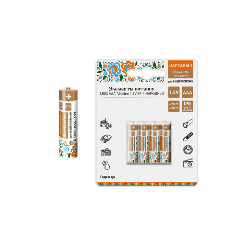 Описание Элемент питания LR03 AAA Alkaline 1,5V BP-4 Народный SQ1702-0008