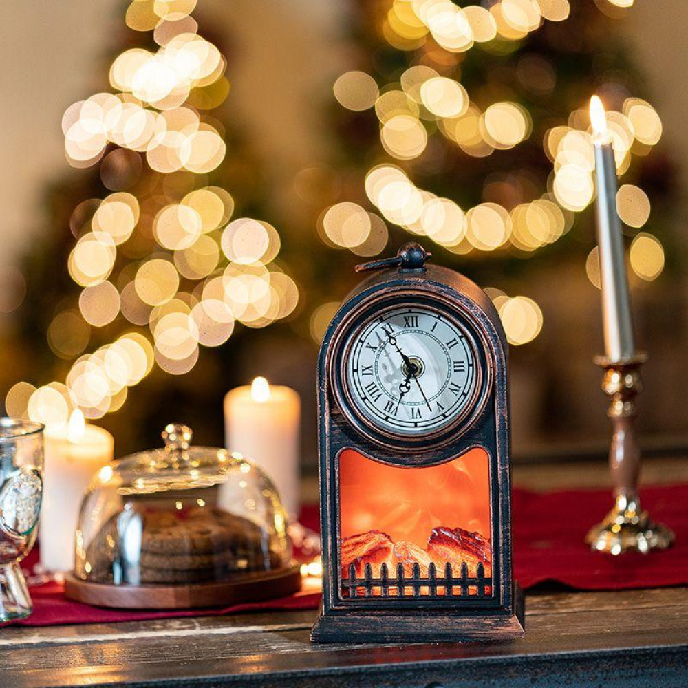 Описание Светодиодный камин Старинные часы с эффектом живого огня 14,7x11,7x25 см, бронза, батарейки 2хС (не в комплекте) USB 511-021