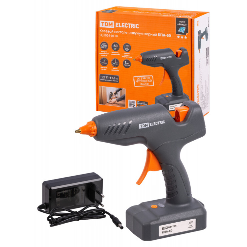 Клеевой пистолет аккумуляторный КПА-60, 11,3 мм, 12В, 2,2 А*ч Li-Ion, 60 Вт, Т=220 С "Алмаз" SQ1024-0110, Пистолет клеевой