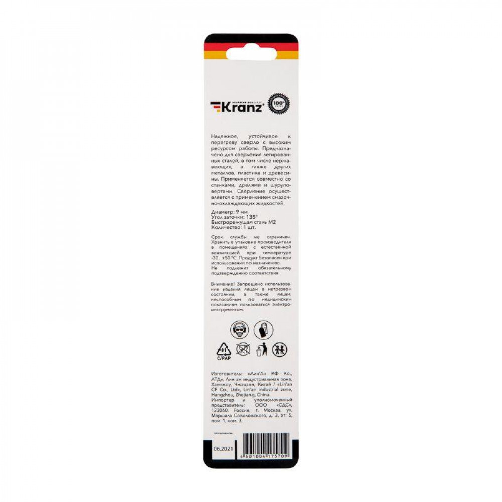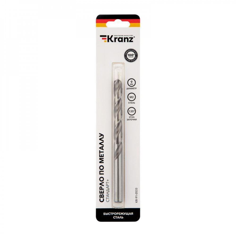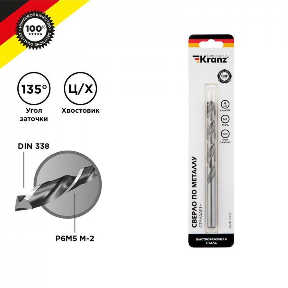 Сверло по металлу 9х125х81 мм «Стандарт+» (P6M5 M-2) (1 шт. в блистере) DIN 338 KR-91-0533, Сверло, метчик, плашка