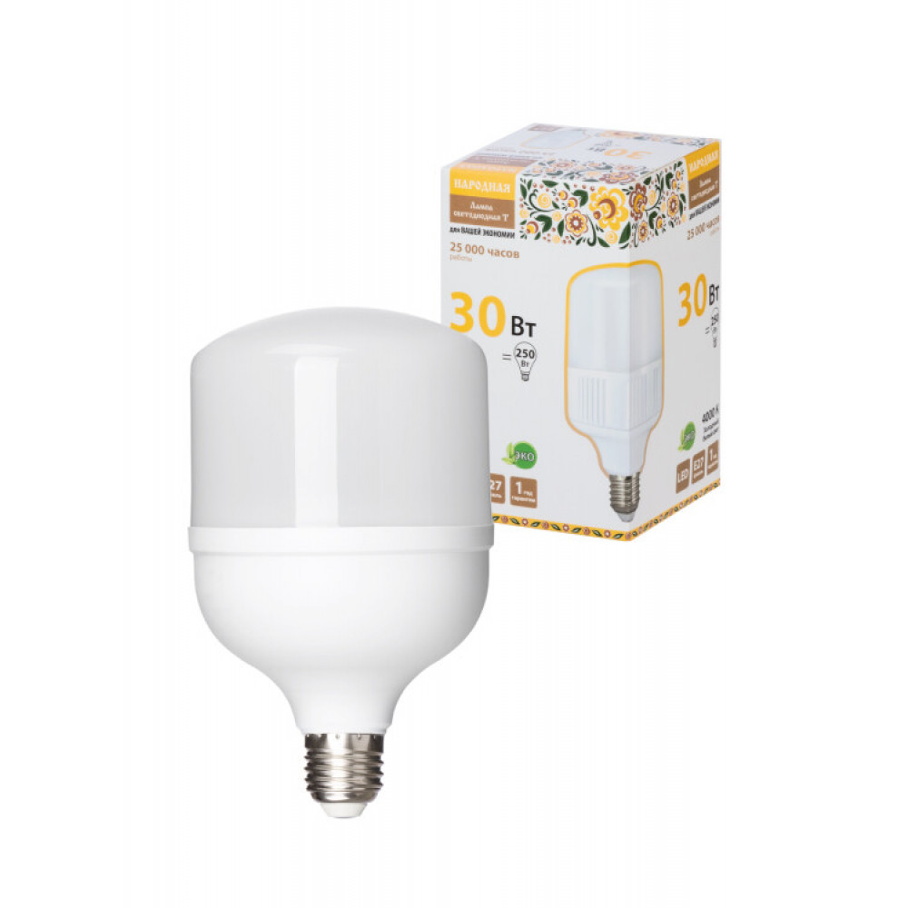Лампа светодиодная T-30 Вт-230 В-4000 К–E27 (99x168 мм) Народная SQ0340-1642, Лампа светодиодная