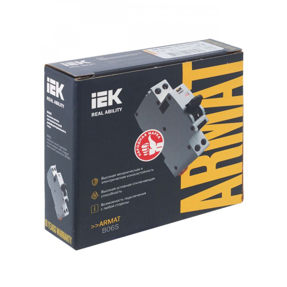 Автоматические выключатели дифференциального тока (АВДТ) ARMAT серии B06S могут осуществляют функции защиты от токов перегрузки и короткого замыкания и защиты человека от токов замыкания на землю. Модельный ряд включает в себя устройства с номинальными токами от 6 до 32 А, характеристиками срабатывания по сверхтоку B и C, типами защит AC и A с номинальным дифференциальным током отключения 30 мА. Номинальная отключающая способность АВДТ ARMAT серии B06S составляет 6 кА.