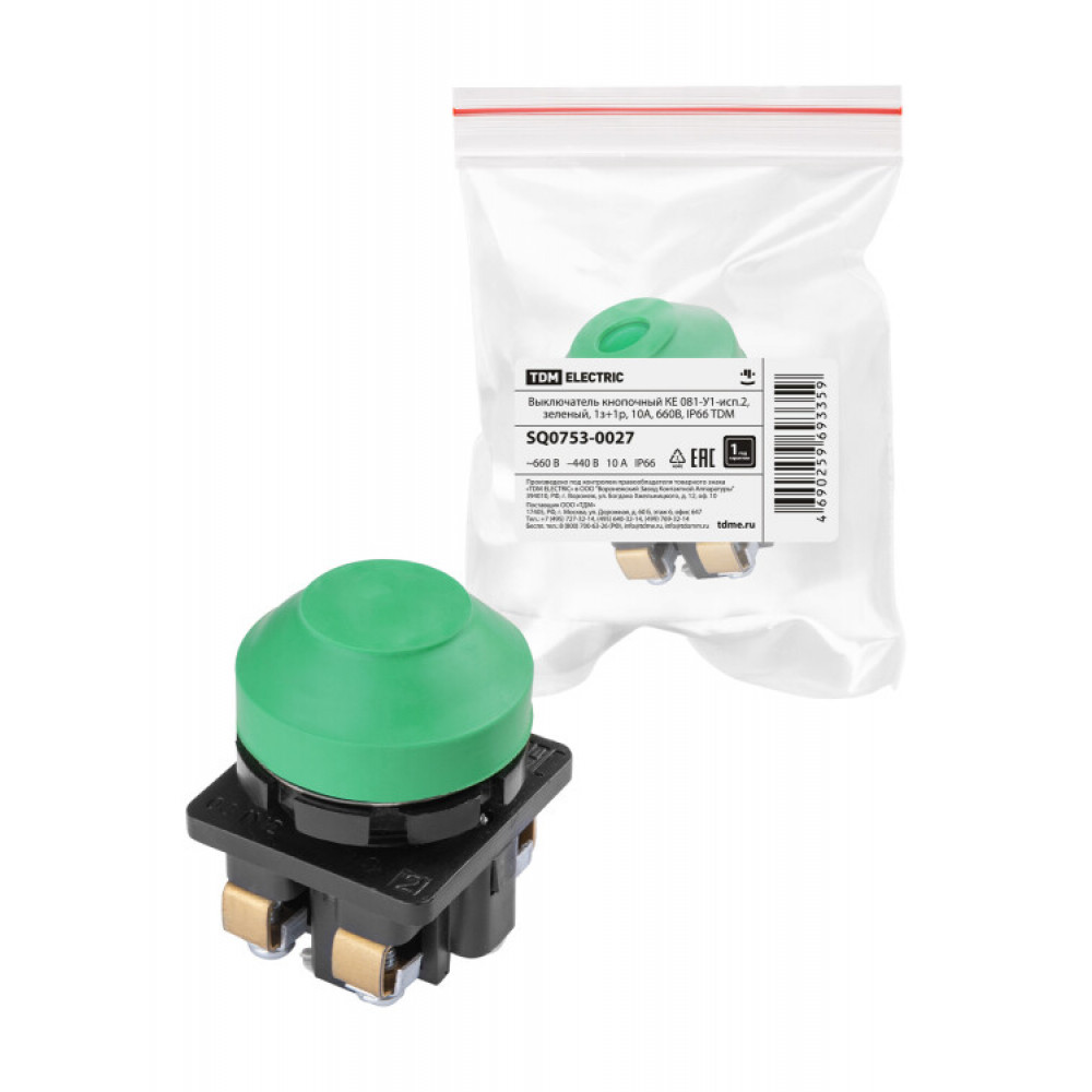 Описание Выключатель кнопочный КЕ 081-У1-исп.2, зеленый, 1з+1р, 10A, 660B, IP66 SQ0753-0027