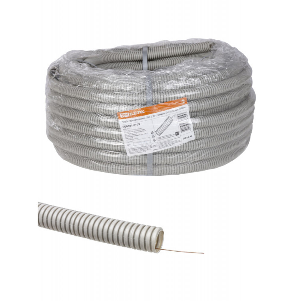 Труба гофрированная ПВХ d 25 с зондом (50 м) тяжелая SQ0401-0103, Труба и короб для прокладки кабеля