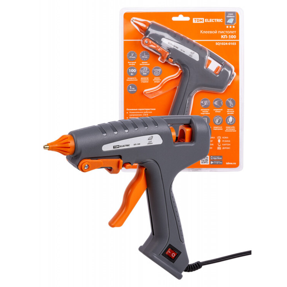 Описание Клеевой пистолет КП-100, 11,3 мм, подставка, выключатель, шнур 1,5 м, 100 Вт, Т=220 С "Алмаз" SQ1024-0103