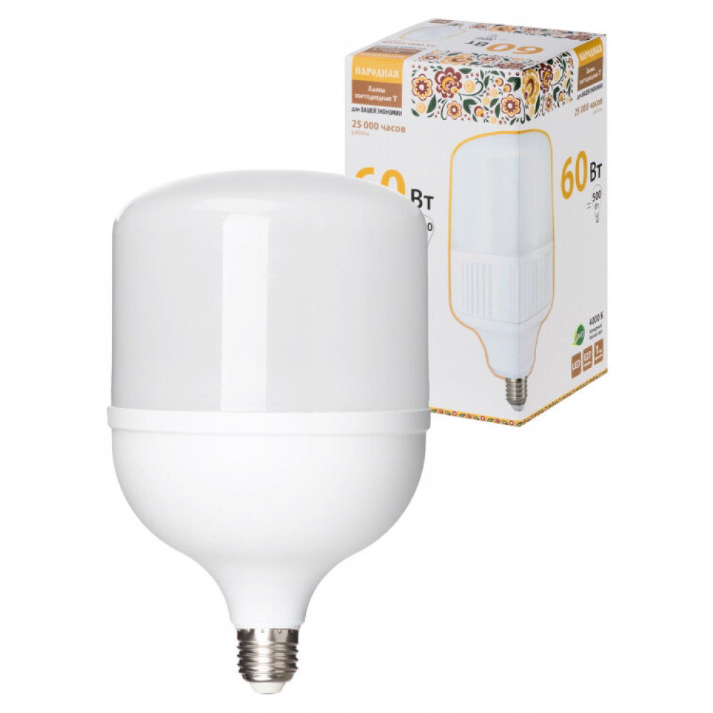 Описание Лампа светодиодная T-60 Вт-230 В-4000 К–E27 (135x225 мм) Народная SQ0340-1648