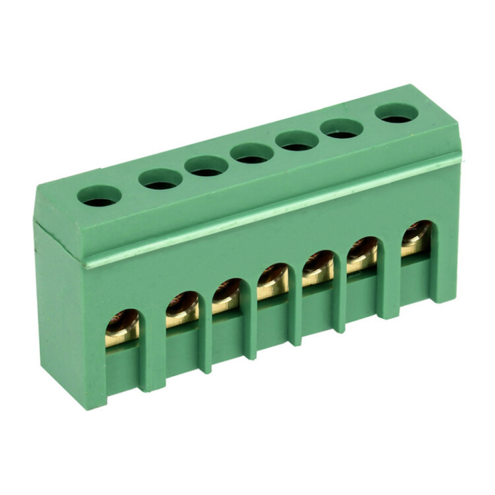 Шина PE «земля» в корпусном зеленом изоляторе на DIN-рейку 6x9 мм 7 групп 11-2321, Блок клеммный и нулевая шина