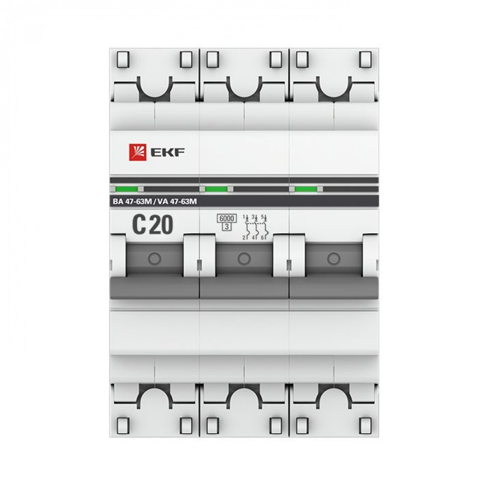 Автоматический выключатель 3P 20А (C) 6кА ВА 47-63M без теплового расцепителя PROxima mcb4763m-6-3-20C-pro, Выключатель автоматический модульный