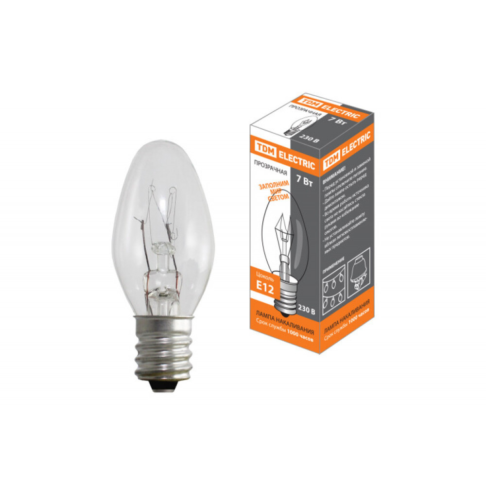 Лампа накаливания "Свеча мини прозрачная" 7 Вт-230 В-50 Гц-Е12, SQ0332-0054, Лампа накаливания