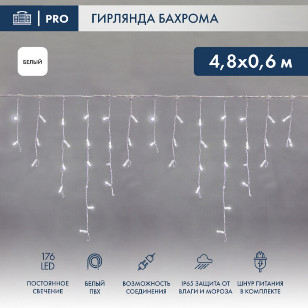 Описание Гирлянда Айсикл (бахрома) светодиодный, 4,8 х 0,6 м, белый провод, 230 В, диоды белые, 176 LED 255-137