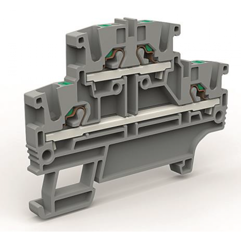 Этажная клемма, 2 этажа, тип фиксации провода: пружинный, номинальное сечение: 2,5 мм кв., 22A, 500V, ширина: 5,2 мм, цвет: серый, тип монтажа: DIN35