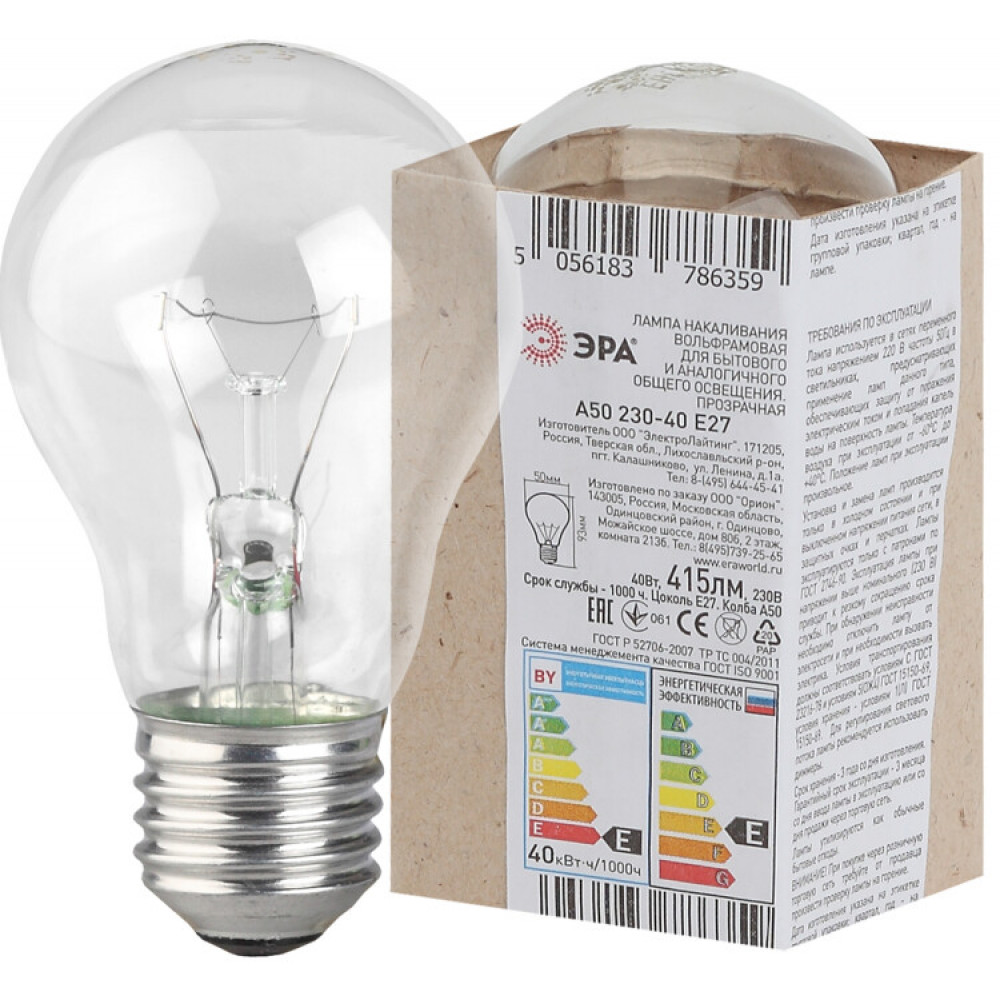 A50 (груша) 40Вт 230В Е27 в гофре (100/3600) Б0039117, Лампа накаливания