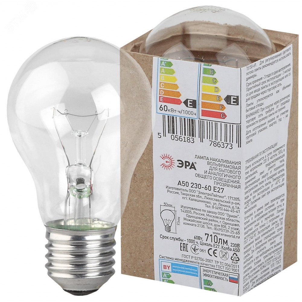 A50 (груша) 60Вт 230В Е27 в гофре (100/3600) Б0039118, Лампа накаливания