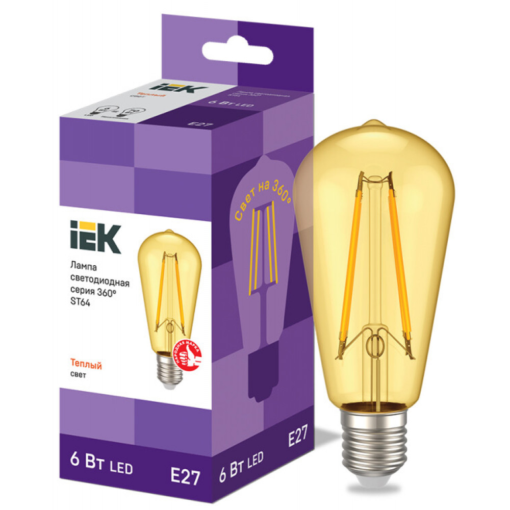 Лампа LED ST64 золото 6Вт 230В 2700К E27 серия 360° IEK с нитевидным светодиодом (филаментная нить) является одним из самых эффективных источников света.