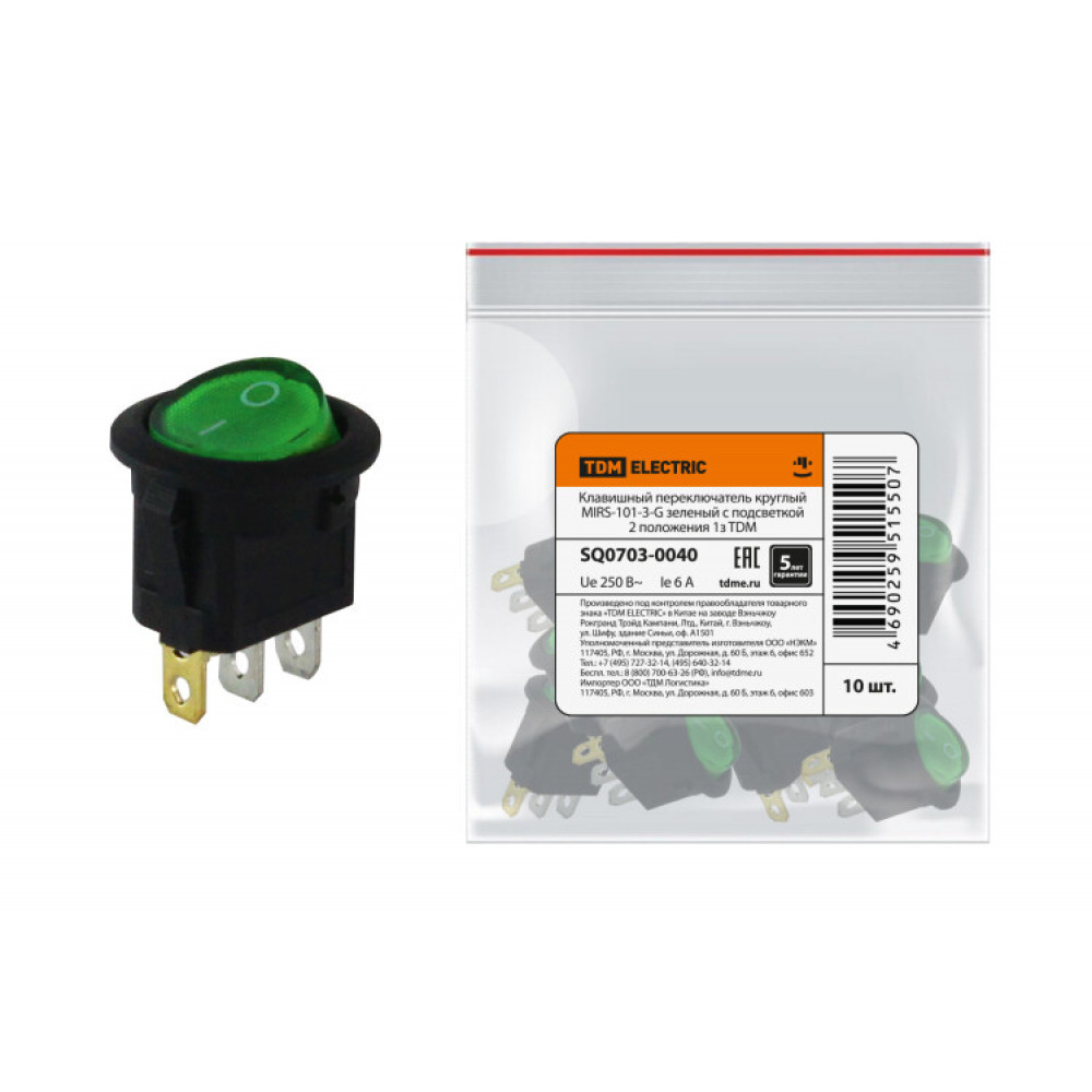 Клавишный переключатель круглый MIRS-101-3-G зеленый с подсветкой 2 положения 1з SQ0703-0040, Изделие электроустановочное