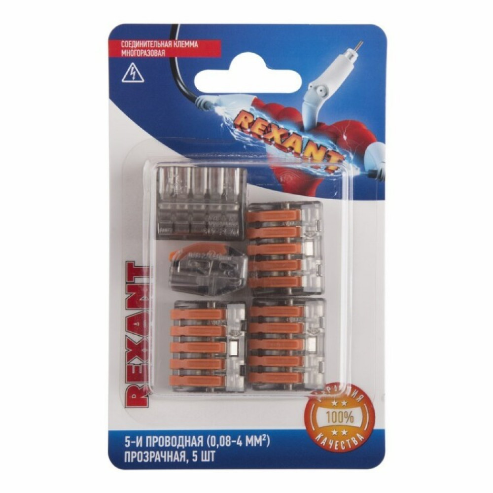Рычажная клемма, соединительная, универсальная, 5 полюсов, сечение проводника 0,08 - 4,0 мм кв., 250V, 32A,цвет корпуса: прозрачный, цвет рычагов: оранжевый,в упаковке 50 штук (Аналог 222-415)