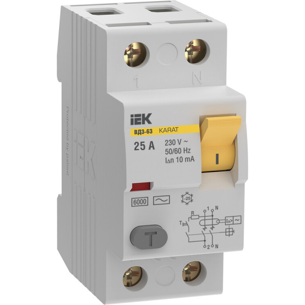 УЗО KARAT ВД3-63 2P 25А 10мА 6кА тип AC MDV20-2-025-010, Дифференциальная защита: УЗО, дифф блок