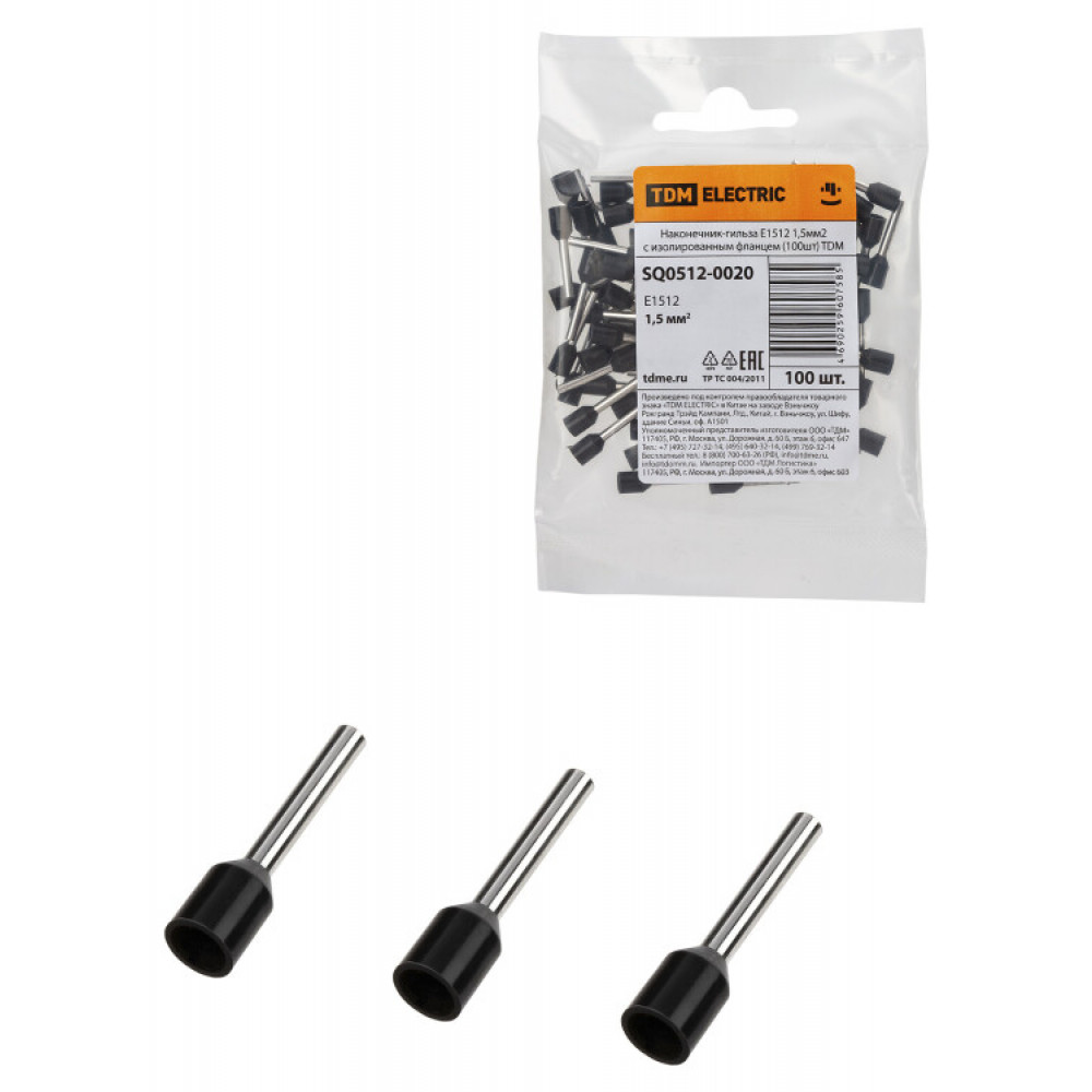 Наконечник-гильза Е1512 1,5мм2 с изолированным фланцем (100шт) SQ0512-0020, Наконечник, гильза