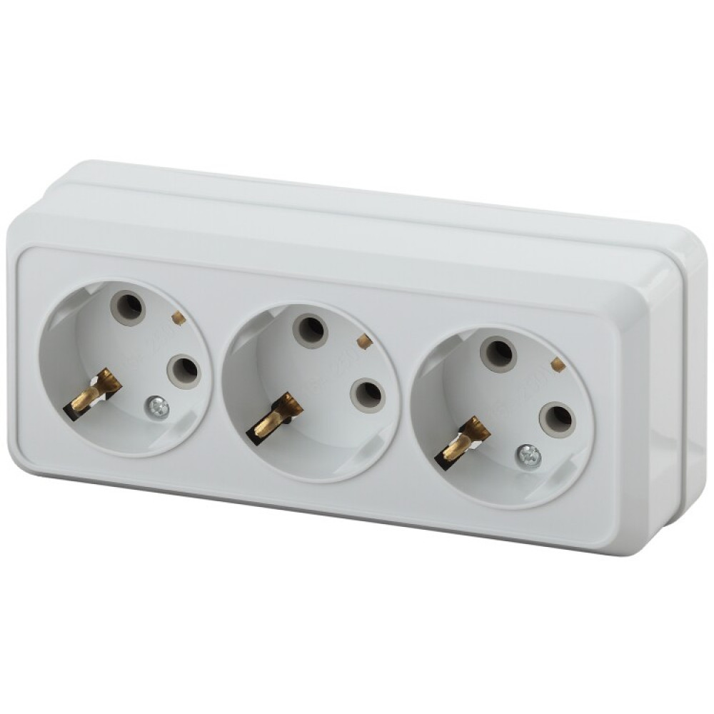 Розетка Quadro 2-206-01 с заземлением трехместная 3х2P+E, 16А-250В, IP20, ОУ, белый Б0053819, Розетка открытого монтажа