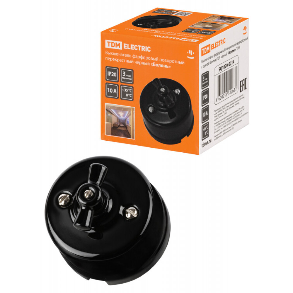 Выключатель фарфоровый поворотный перекрёстный с ручкой (бантик) 10А черный «Болонь» SQ1820-0214, Изделие электроустановочное