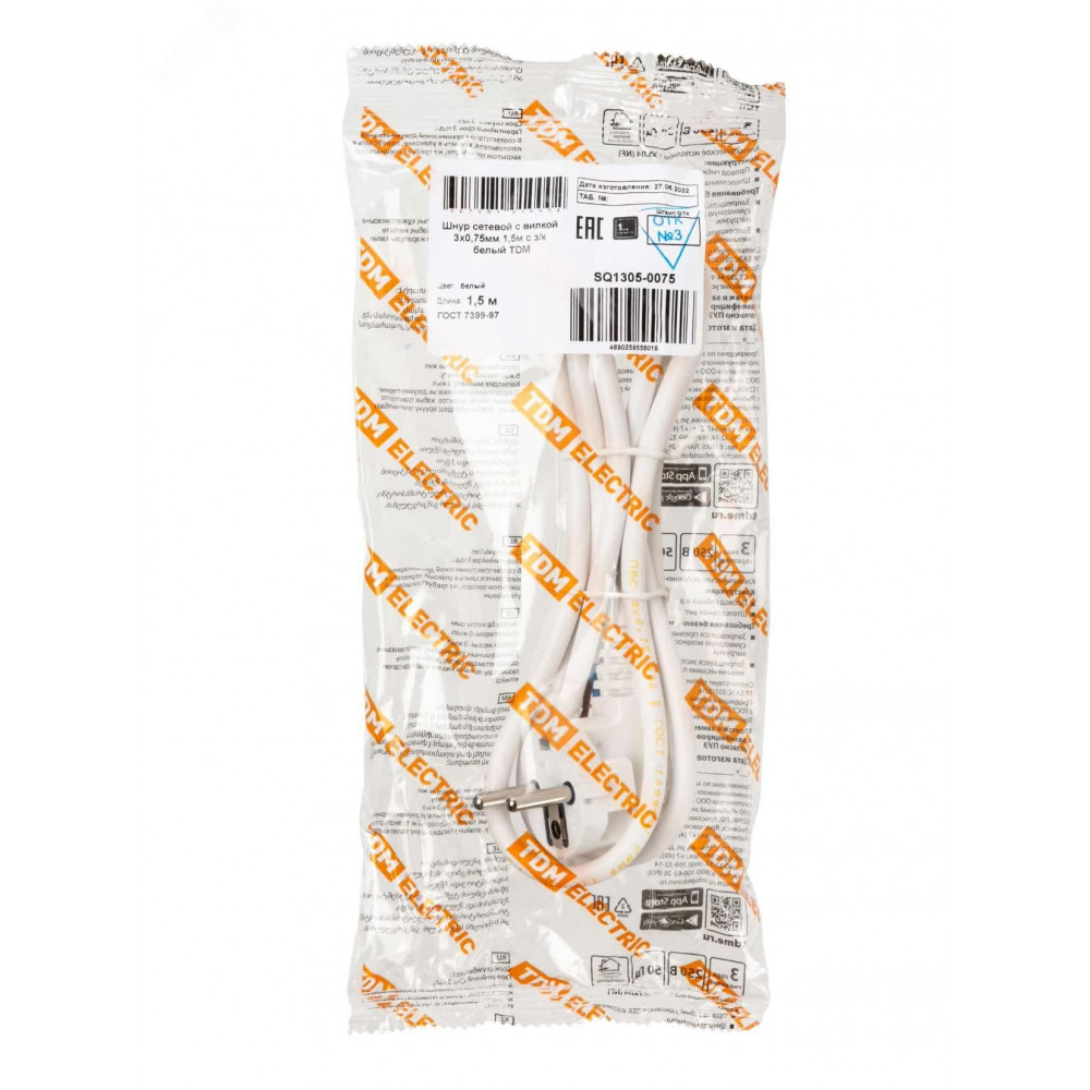Шнур сетевой с вилкой ПВС 3x0,75мм2 1,5м с/з белый SQ1305-0075, Удлинитель, сетевой фильтр