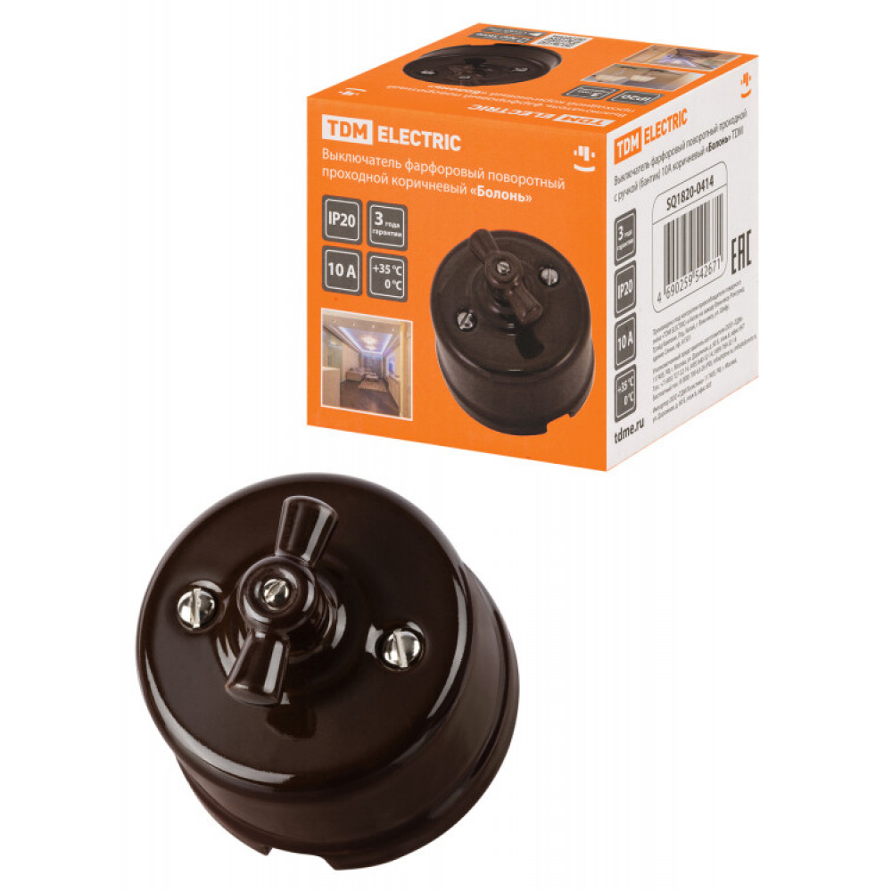 Выключатель фарфоровый поворотный проходной с ручкой (бантик) 10А коричневый «Болонь» SQ1820-0414, Изделие электроустановочное