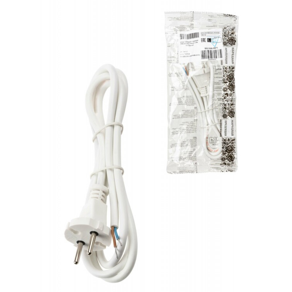 Шнур сетевой с вилкой ПВСмб 2x0,75мм2 1,5м б/з белый Народный SQ1305-0571, Удлинитель, сетевой фильтр