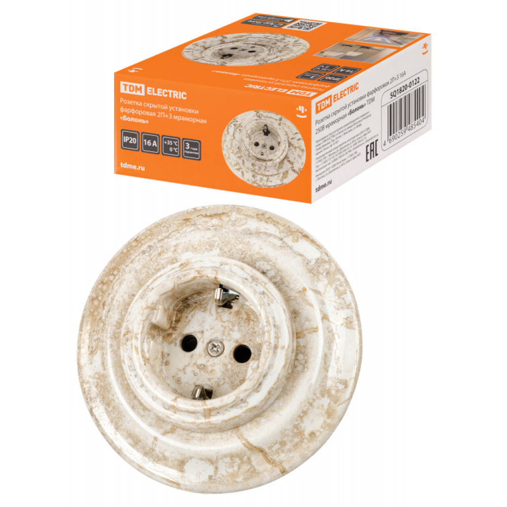 Розетка скрытой установки фарфоровая 2П+З 16А 250В мраморная «Болонь» SQ1820-0122, Розетка скрытого монтажа