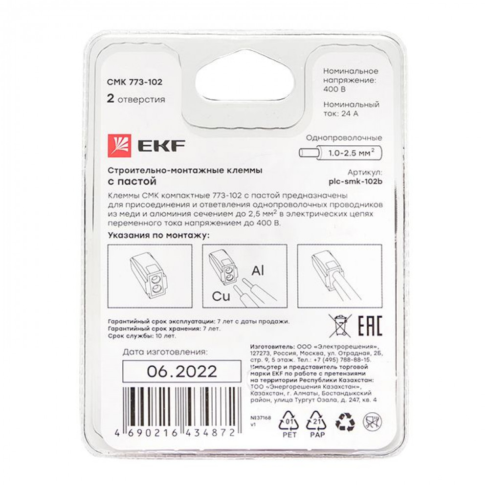 Каждая упаковка содержит по пять клемм. Прочный пластик дает дополнительную защиту изделиям, а лаконичный дизайн с яркими цветами выгодно выделяется на полках магазинов. Антивандальная упаковка полностью запаяна, что исключит ее несанкционированное вскрытие в магазине. Клеммы СМК с пастой EKF предназначены для присоединения и ответвления одножильных проводников из меди и алюминия или многожильного медного провода с наконечником в электрических цепях переменного тока с частотой 50 Гц напряжением до 400 В. Контактная паста автоматически снимает окисную пленку с алюминиевых проводов и предохраняет их от повторного окисления. Клеммы можно использовать при температуре от –40 до +40° C.