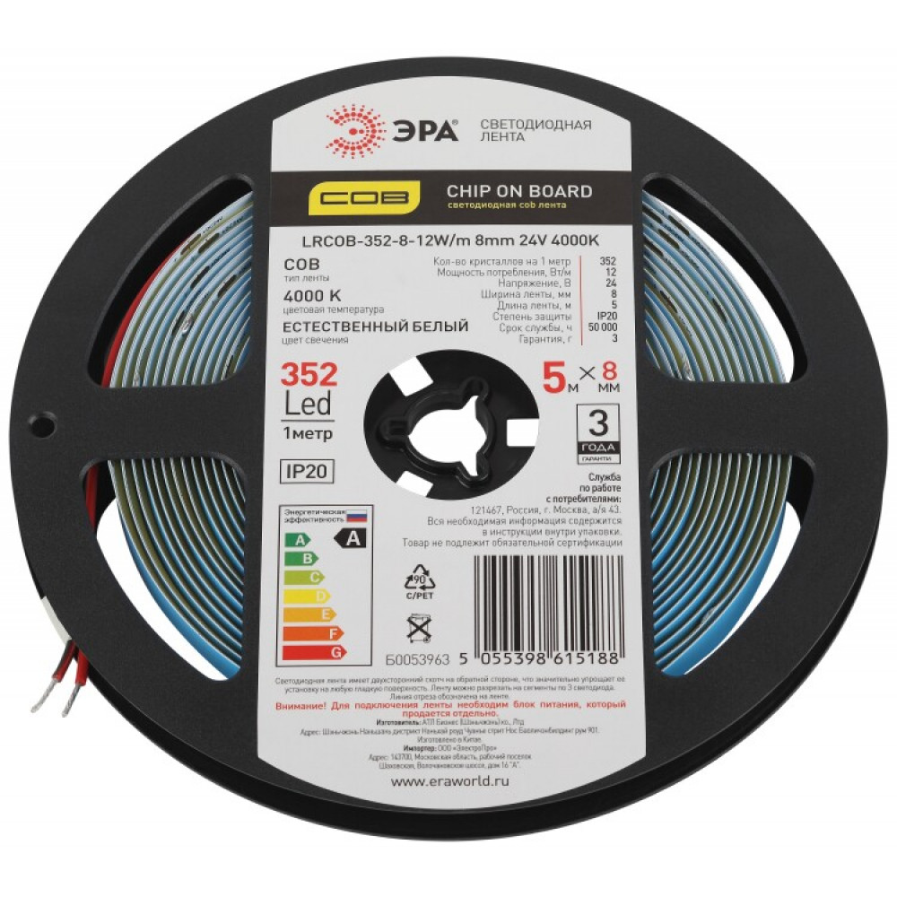 Описание Лента светодиодная LRCOB-352-8 12W/m 8mm 24V 4000K 3year белая 5 м Б0053963