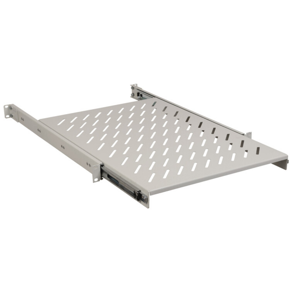 Выдвижные полки крепятся на фронтальные и на задние профили, имеют перфорированную поверхность для обеспечения лучшего охлаждения и отведения теплых воздушных потоков, а за счёт наличия специальных телескопических салазок способны плавно выдвигаться вперед за пределы рабочей плоскости, образованной передней парой 19'' профилей. Данные полки рассчитаны на оборудование, требующее регулярного обслуживания и извлечения из шкафа, но с небольшой общей массой, чтобы избежать его опрокидывание и возможной поломки выдвижного механизма полки.