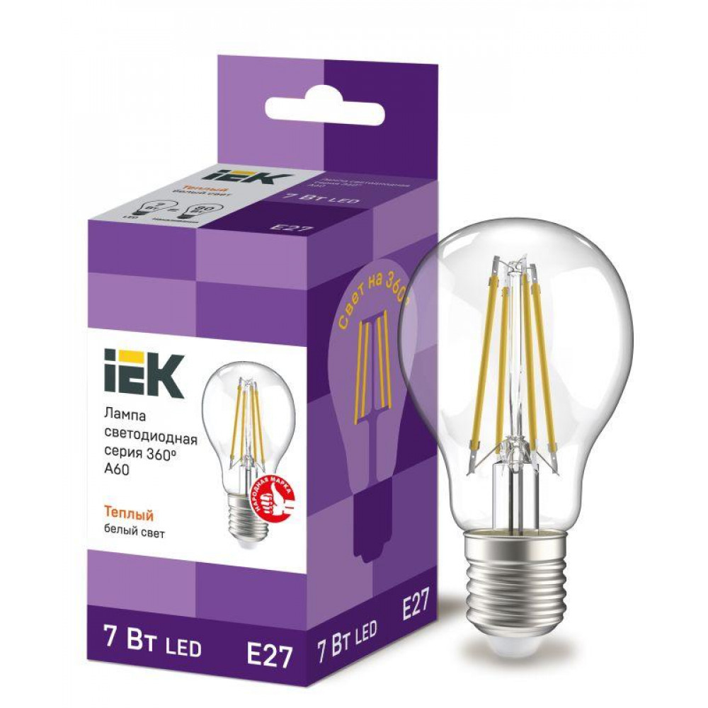 Лампа LED A60 груша прозр. 7Вт 230В 3000К E27 серия 360° IEK с нитевидным светодиодом (филаментная нить) является одним из самых эффективных источников света.