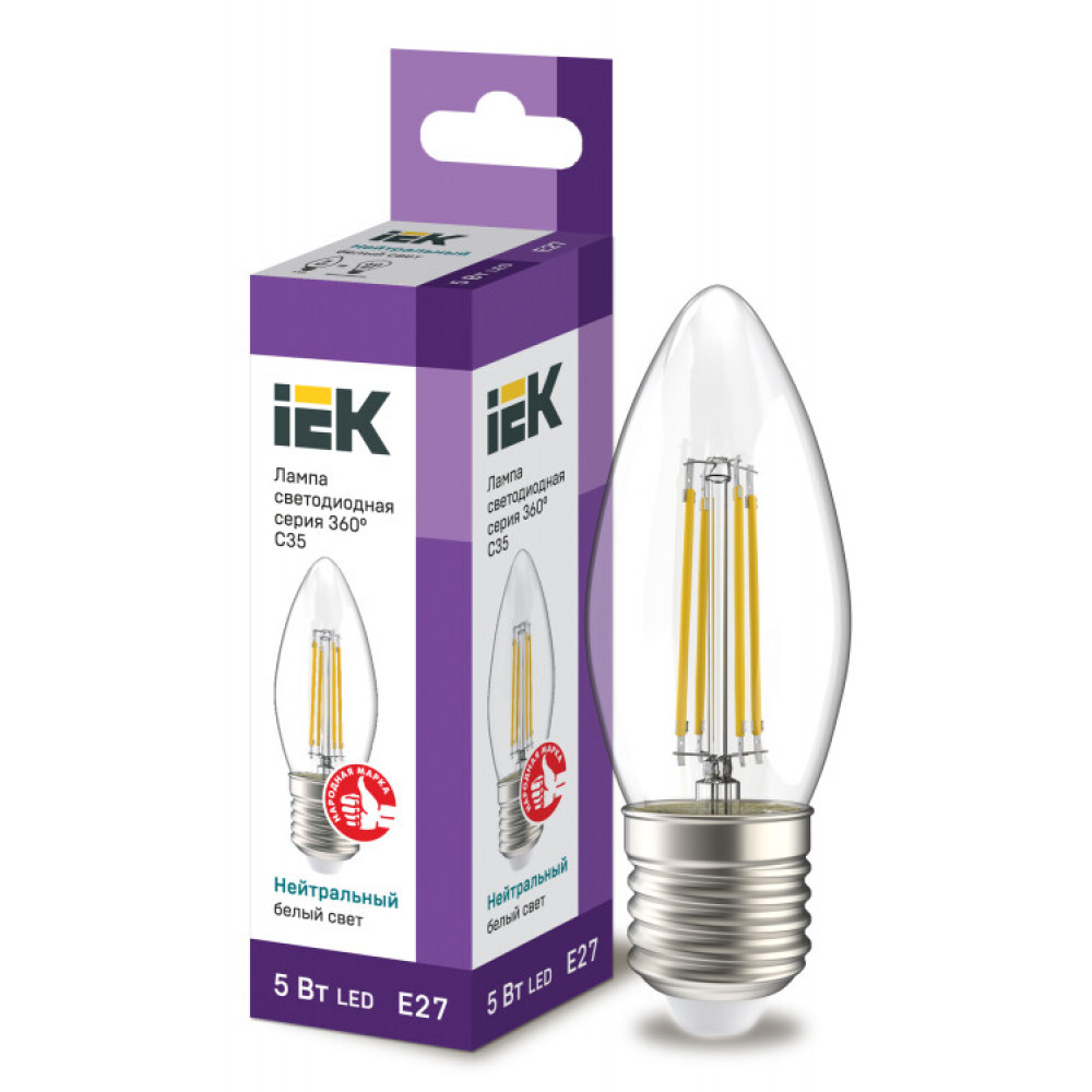 Лампа LED C35 свеча прозр. 5Вт 230В 4000К E27 серия 360° IEK с нитевидным светодиодом (филаментная нить) является одним из самых эффективных источников света.