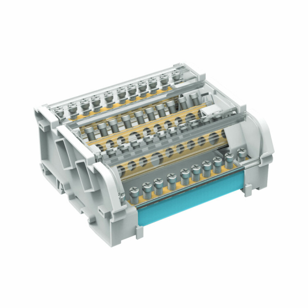 Предназначен для структурированного подключения отводных линий, разведения входящего проводника на несколько потребителей или участков. Позволяет создать упорядоченные системы распределения в электрощитах. Корпус блока выполнен из не поддерживающего горение полиамида PA6.6 и 4-х токоведущих шин в блоках 125 А, представляющие собой бруски из латуни с 11-ю отверстиями, в которые вставляются провода и зажимаются винтом. Избежать случайного прикосновения к токоведущим частям позволяет защитный экран на корпусе блока. Наличие задней крышки для предотвращения контакта с DIN-рейкой или металлической поверхностью сзади.