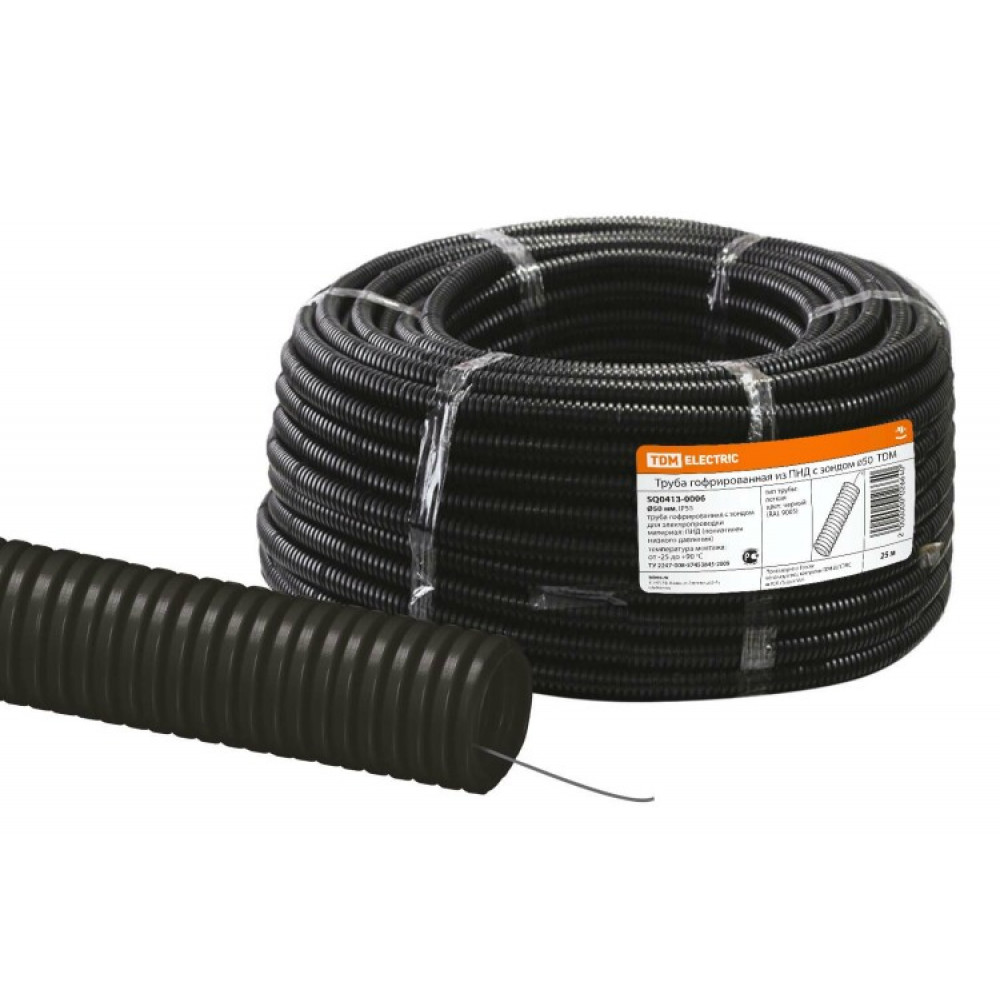 Труба гофрированная ПНД d 50 с зондом (25 м) легкая черная SQ0413-0006, Труба и короб для прокладки кабеля