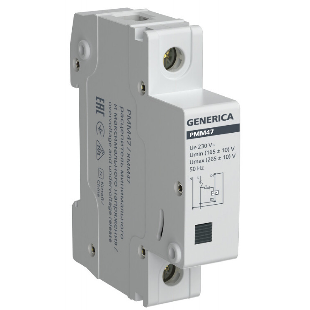 Расцепитель минимального/максимального напряжения РММ47 на DIN-рейку отключает автоматический выключатель при выходе напряжения за допустимые пределы (165–265 В).