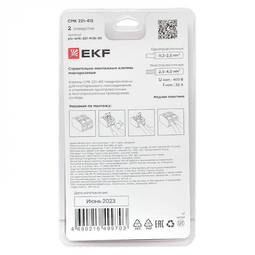 Клемма СМК 221-412 с рычагом 2 отверстия 0.2-4.0 мм2 блистер (20 шт.) PROxima plc-smk-221-412b-20, Строительно-монтажная клемма и скрутка