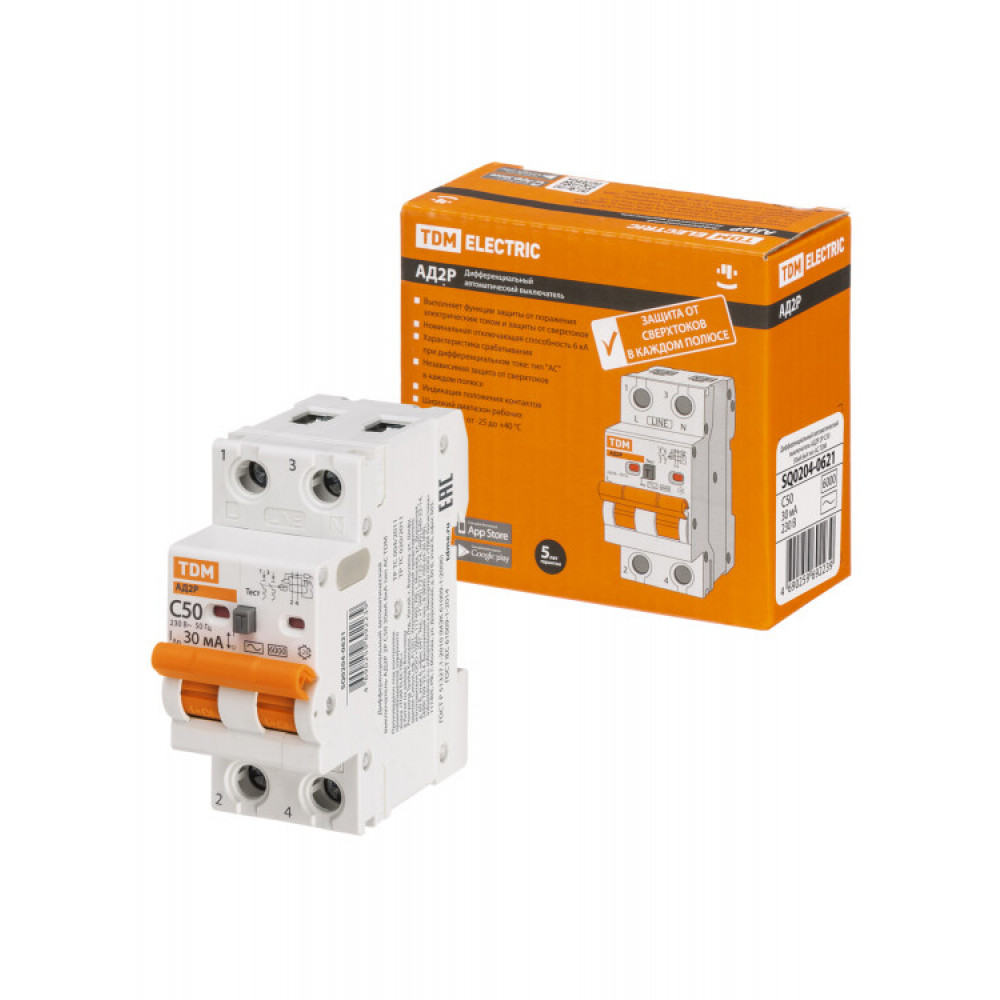 Описание Диф.автомат АД2P 2Р С50 30мА 6кА тип АС SQ0204-0621