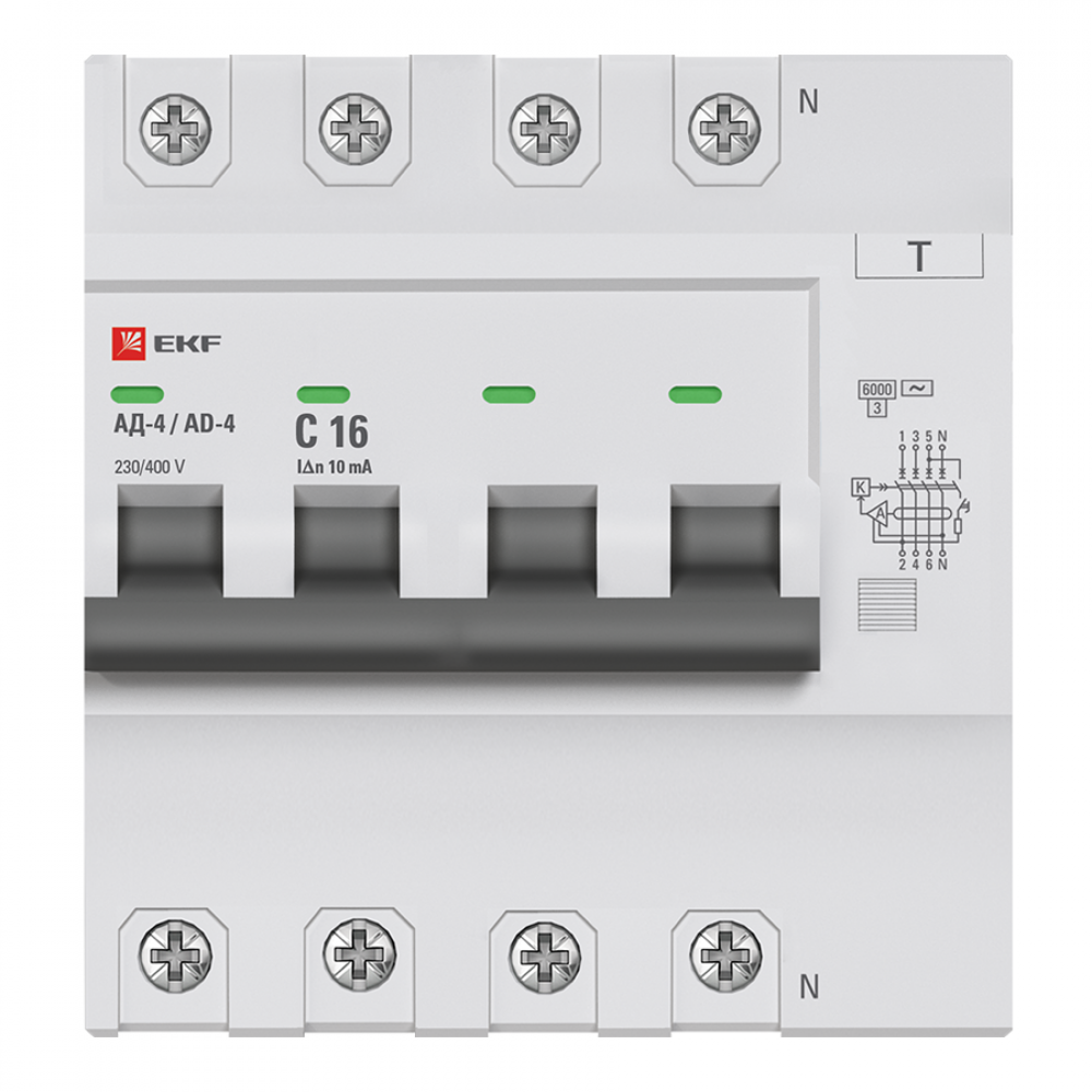Дифференциальный автомат АД-4 16А/10мА (х-ка C, АС, электронный) 6кА PROxima DA4-6-16-10-pro, Дифференциальная защита: УЗО, дифф блок